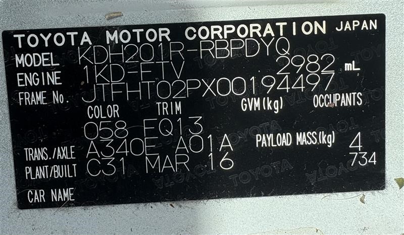 2016 Toyota Hiace 200 Series RWD Automatic Van