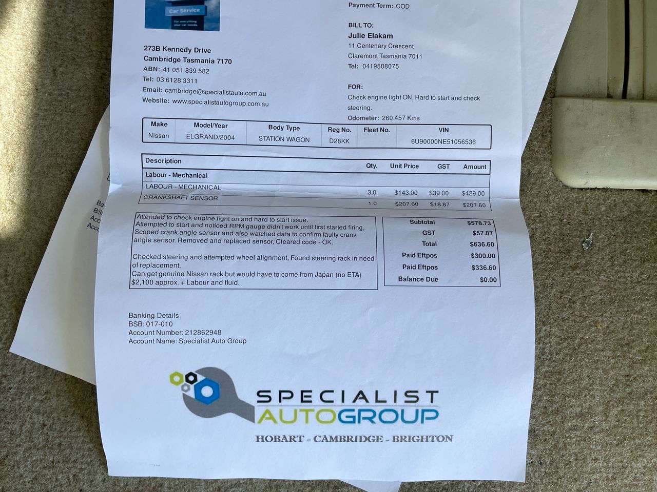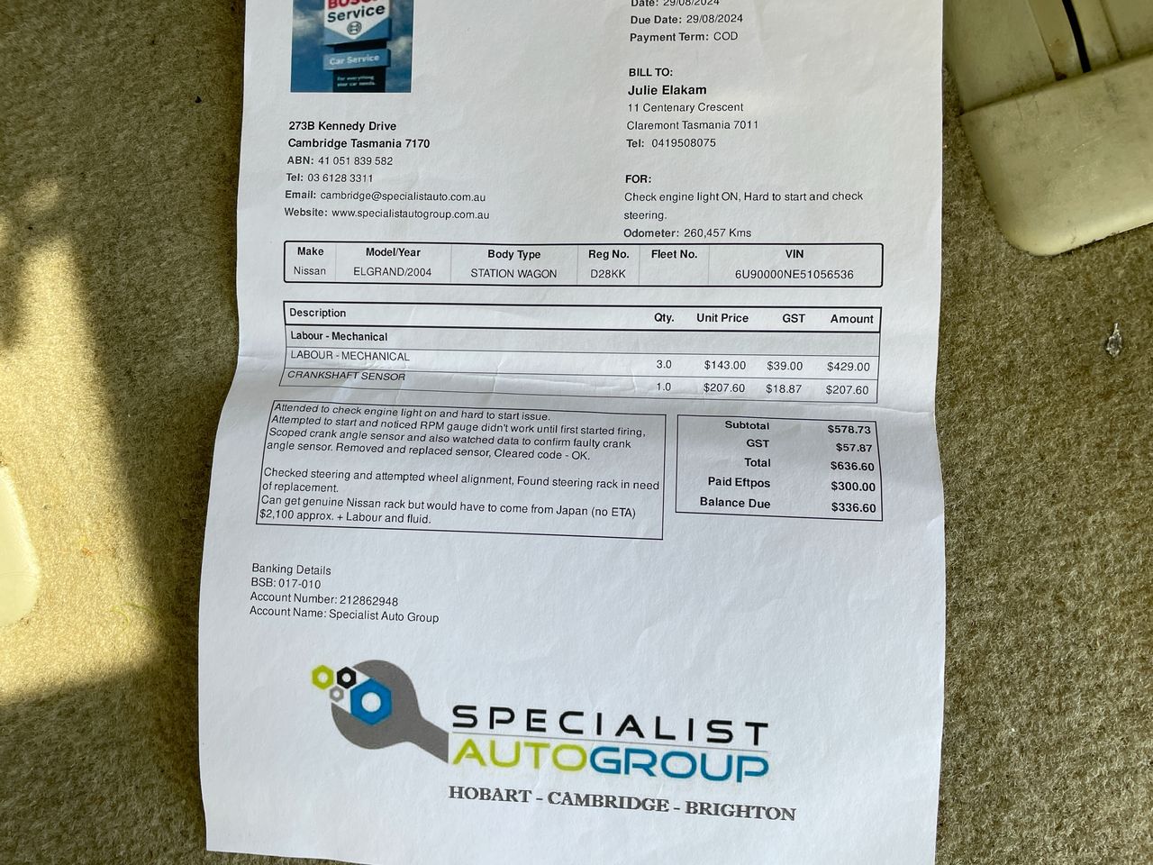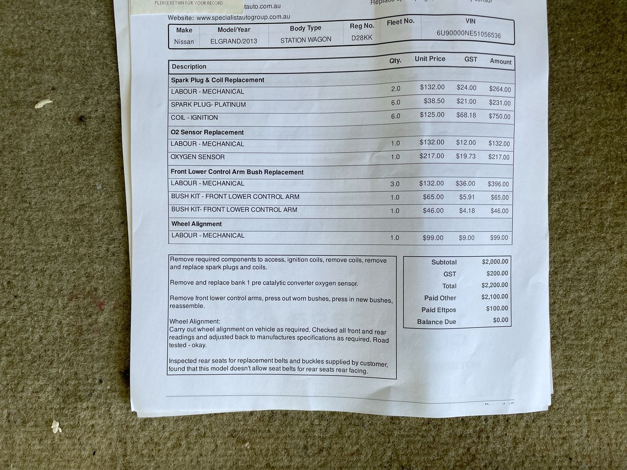 * This vehicle is over 15 years old and has travelled more than 150,000kms. Grays strongly recommends a mechanical inspection be completed prior to bidding. The vehicle may require repairs and maintenance. Please consider this when purchasing as Grays does not conduct any mechanical checks on its vehicles and the sale of this vehicle is in an auction context on an βas is, where isβ basis. 2004 Nissan Elgrand Automatic Van No. of Seats: 4 Build Date: 2004-03 Compliance Date: 2013-02 VIN: 6U90000NE51056536 Registration No: 2ED6QX Registration State: VIC Registration Expiry Date: 21-07-2026 - Registration will only be transferred to the registered bidder who must hold a valid VIC Drivers Licence otherwise vehicle will be sold unregistered. No. of Plates: 2 No. of Cylinders: 6 Engine Capacity: 3.5 Fuel Type: Petrol Transmission: Automatic Indicated Odometer Reading: 289499 Odometer Measurement: kilometre Exterior Colour: Silver Interior Colour: Grey General Condition for age and distance travelled: Key: Yes Spare Key: No Owners Manual: No Service History: Partial Engine Turns Over: Yes The below condition assessment is the opinion of our booking staff which may differ from your own opinion: Engine Smoke visible Medium Scratch on Around vehicle Paint fading Around vehicle Door card Worn. Interior: "Seats 4 , Complied 3" Features: Air Conditioning CD Player Central Locking Driver Airbag DVD Player Electric Windows Leather Trim Power Steering Sunroof Location: 140-152 National Drive, Dandenong South, VIC, 3175 Key No: 534 (373119) Motor Dealer Licence: LMCT-11100 (SN:6U90000NE51056536) (140813-1) GST Note: GST will not be added to, or included in, the final bid price of this item. GST is included in the buyers premium. Debit Card / Credit Card / PayPal surcharge fee may apply. See User Agreement