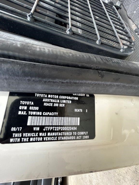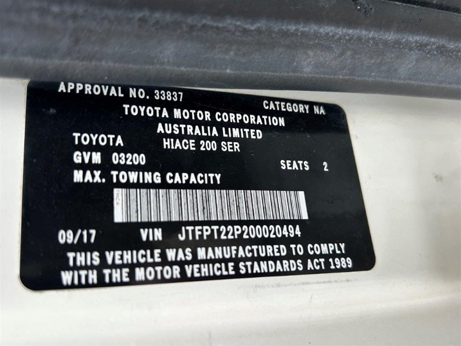 2017 TOYOTA HIACE SLWB T/D 200 SER VVT-I Van Year: 2017 Make: TOYOTA Model: HIACE SLWB T/D 200 SER VVT-I VIN: JTFPT22P200020494 Seats: 2 Doors: 5 Build Date: 09/17 Transmission : 3 SP Auto Cylinders: 4 Fuel Type: Diesel Registration: CN 42 UT Expiry: Sold without plates Odometer Reads: 337610 Colour Exterior: White Colour Interior: Grey Upholstery Includes Owners manual and service book. Features Include: Air Conditioning, Bluetooth Compatibility, CD Player, Drivers Airbag, Front Passengers Airbag, Park Distance Control Rear, Power Steering, Electric Windows, Remote Central Locking, Reverse Camera, Satellite Navigation Other Details: Inspection recommended Please Note: Wear and tear comensurate with the age of the vehicle. See photos for any body and cabin damge.. Worn floor mats to cabin. Chip in windscreen LHS, Minor scratches to LHS panel and minor damge to rear cargo door botton corners. Heavily worn drivers seat upholstery. Note: Sold without plate. Address: 38B Fairey Rd, South Windsor NSW (SN:JTFPT22P200020494) (335016-123) GST Note: GST is included in the final bid price of this item. GST is included in the buyers premium. Debit Card / Credit Card / PayPal surcharge fee may apply. See User Agreement