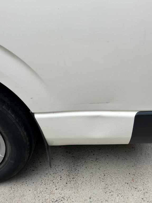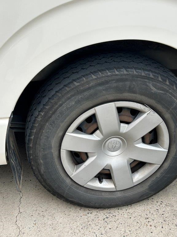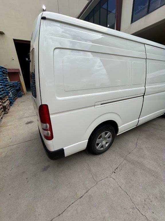 2017 HiAce SLWB diesel with service books and no mechanical faults noted, but 337,610km and unregistered status require budget for re-registration and cosmetic prep. Condition report cites 'Heavily worn drivers seat upholstery' and body defects that need tidying before resale. Strong tradie resale if acquired under $16k all-in.